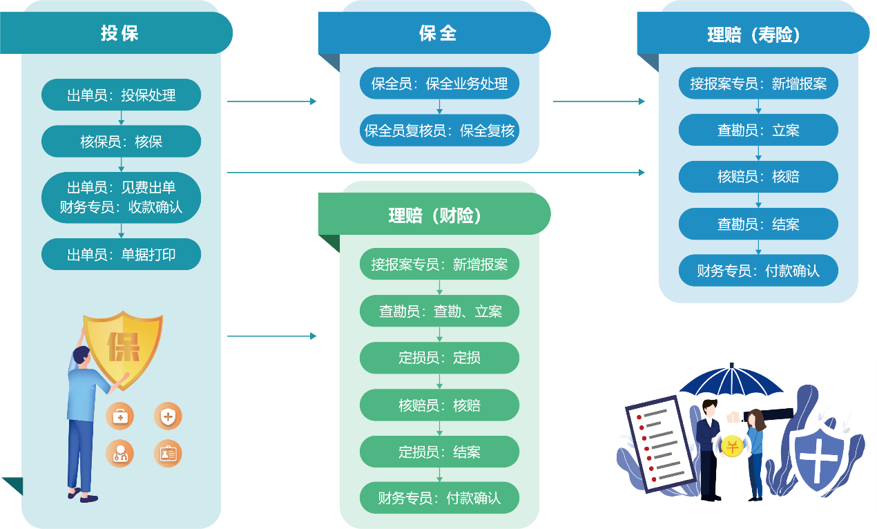 系统包含财寿险的二十一个险种,包括业务员、出单员、核保员、接报案专员、查勘员、定损员、核赔员等九大角色,实现展业、承保、理赔全流程操作。