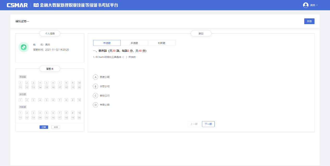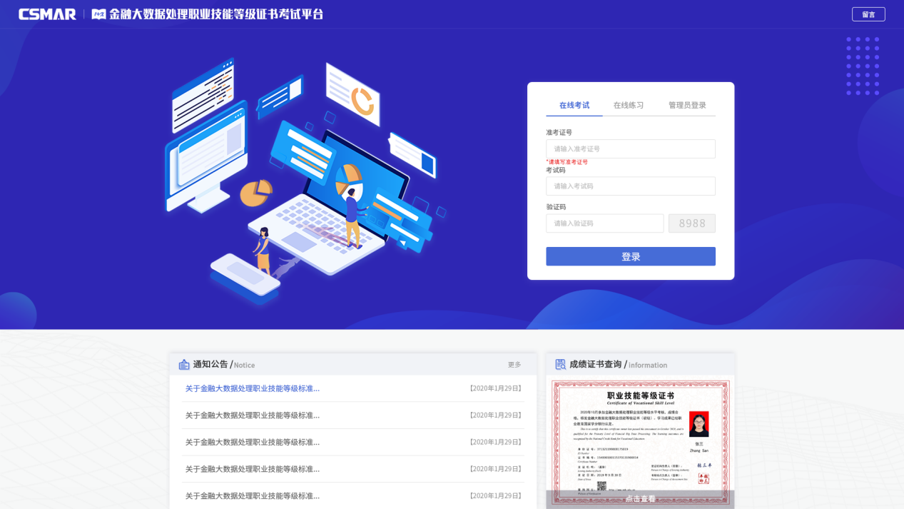 1+X金融大数据处理考试平台是服务于教育部1+X金融大数据处理证书人才技能考核、鉴定的综合考试软件平台,满足金融大数据处理证书初级,中级,高级的考试需求,能为考生给予证书考试的考前练习、模拟考、正式考试。