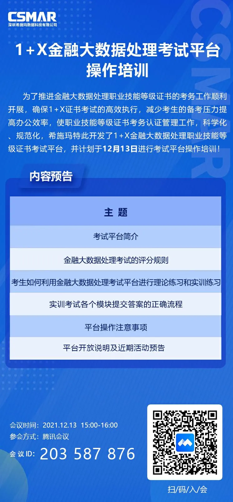 为了推进金融大数据处理职业技能等级证书的考务工作,提高办公效率,使职业技能等级证书考务认证管理工作,科学化、规范化,深圳九州ku游官网特此开发了1+X金融大数据处理职业技能等级证书考试平台,并计划于12月13日召开考试平台操作培训!