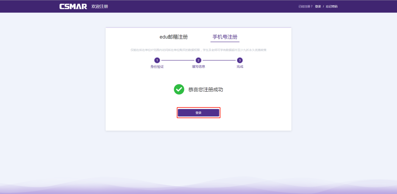 第四步:点击上图的【登录】,显示“登录”界面如下,输入注册的手机号(或edu邮箱)和密码即可登录成功,进行数据查询下载。