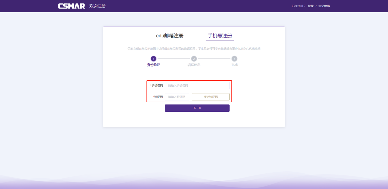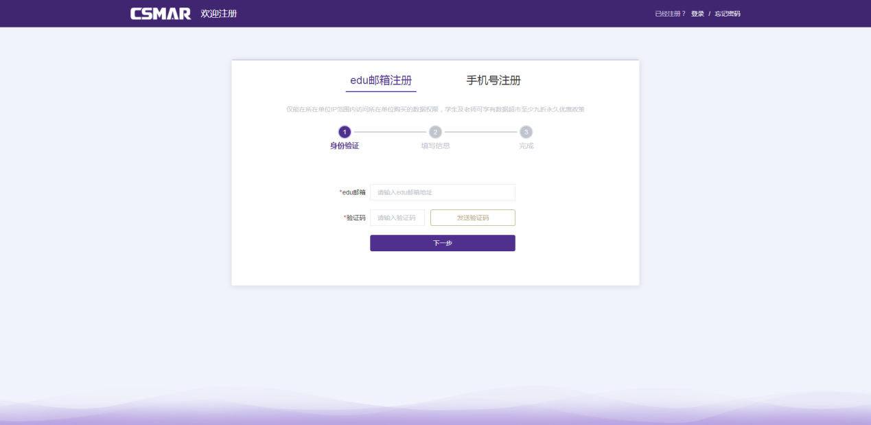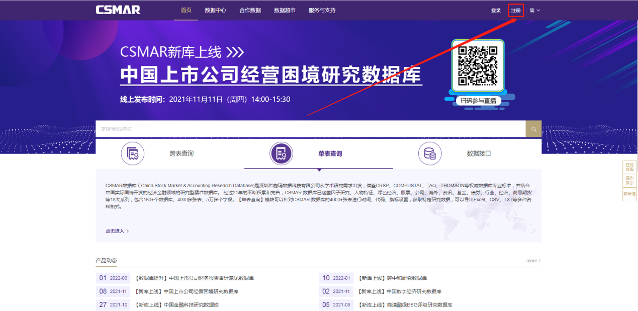 第一步:访问CSMAR数据库网站主页(http://cn.gtadata.com),点击右上角“注册”,进入注册模块。