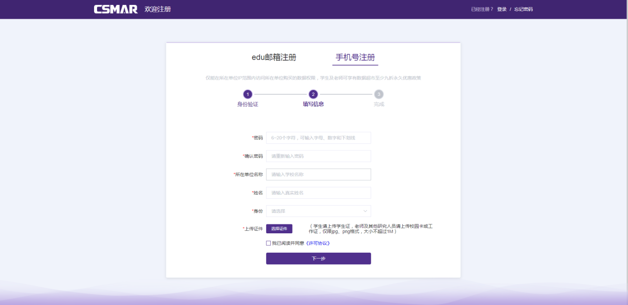 第二步:可选择edu邮箱注册或者手机号注册(区别:手机号注册需要上传学生证/校园卡等证件照片,edu邮箱注册不需要上传),以手机号注册为例,点击上图的【手机号注册】,填写“手机号码”及短信收到的“验证码”,填写成功后,点击【下一步】,显示填写“基本信息”界面。